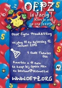 Op 11 en 12 januari vindt dit jaar voor de 5e keer OEPZ plaats en dat vieren we graag! Met een heerlijk programma van eigen bodem wordt het weer lachen en feesten geblazen in 't oude Theater aan de spoorlaan in Oss. Kaarten kosten €11,00 per stuk en zijn te koop bij Opera Men en bestuur@tkennet.nl